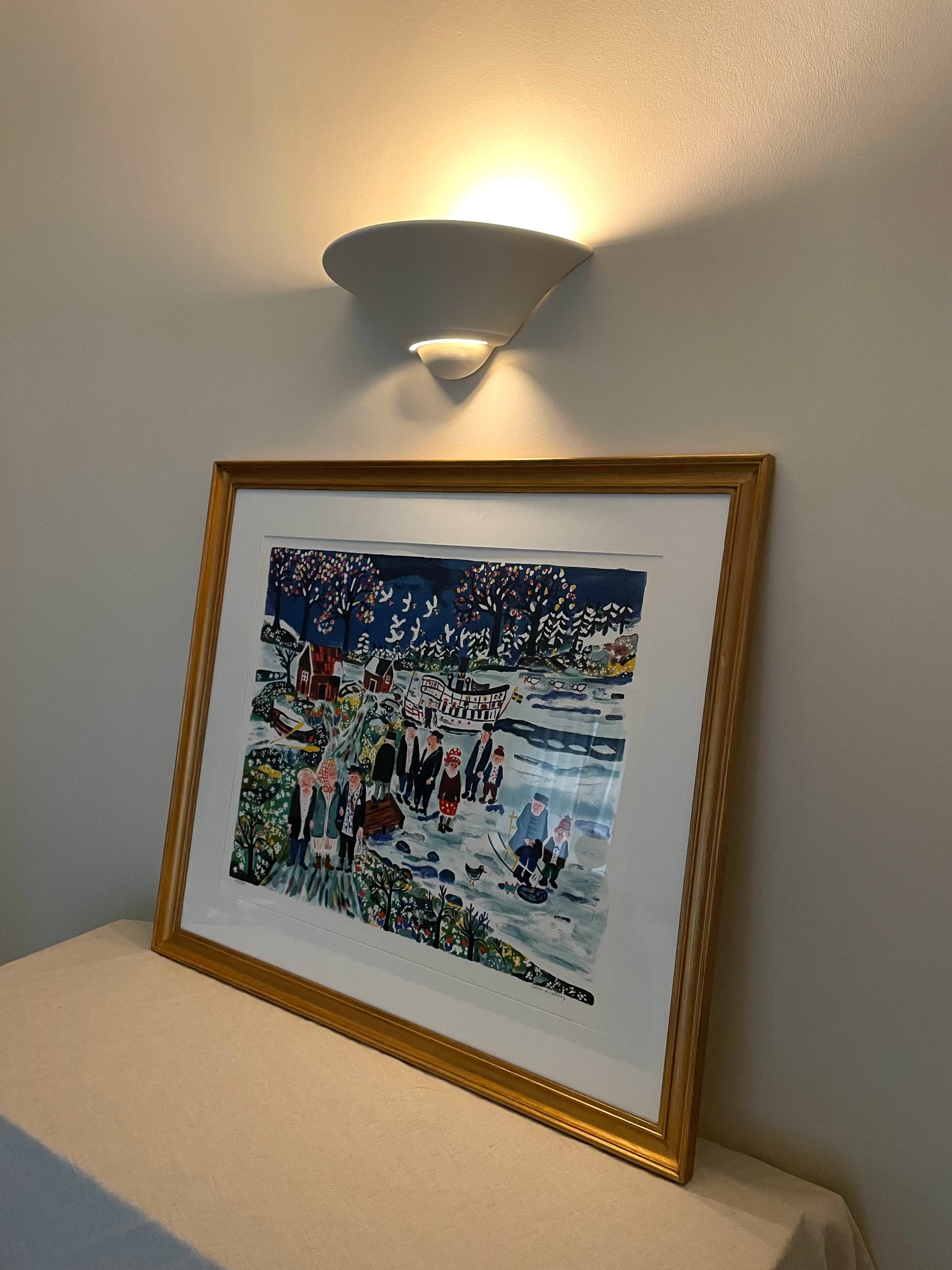 It’s framed in a gold wooden frame and due to its size would look great in a variety of locations such as above a mantel, sideboard, bed or sofa. It is ready to hang via a wire.