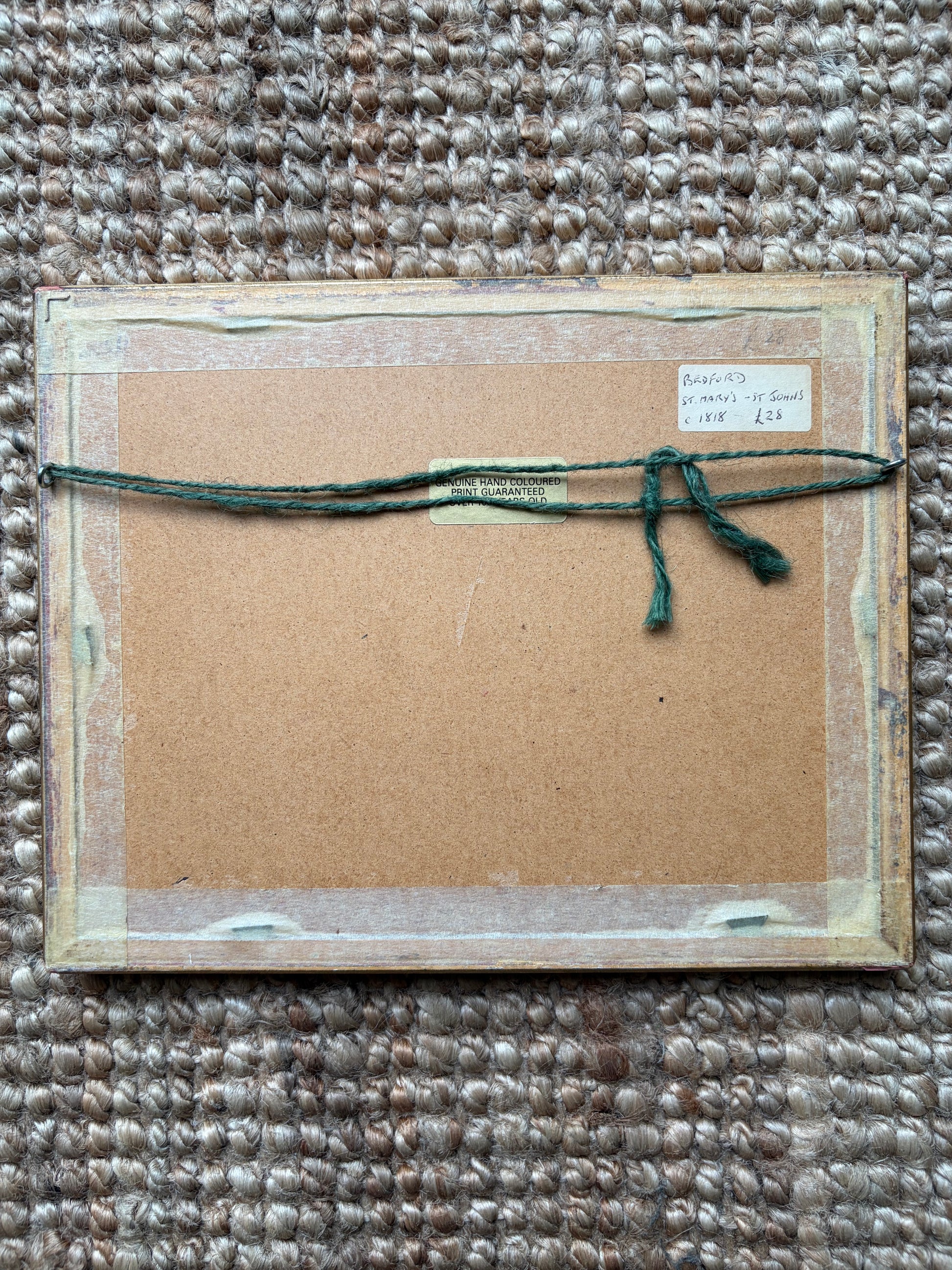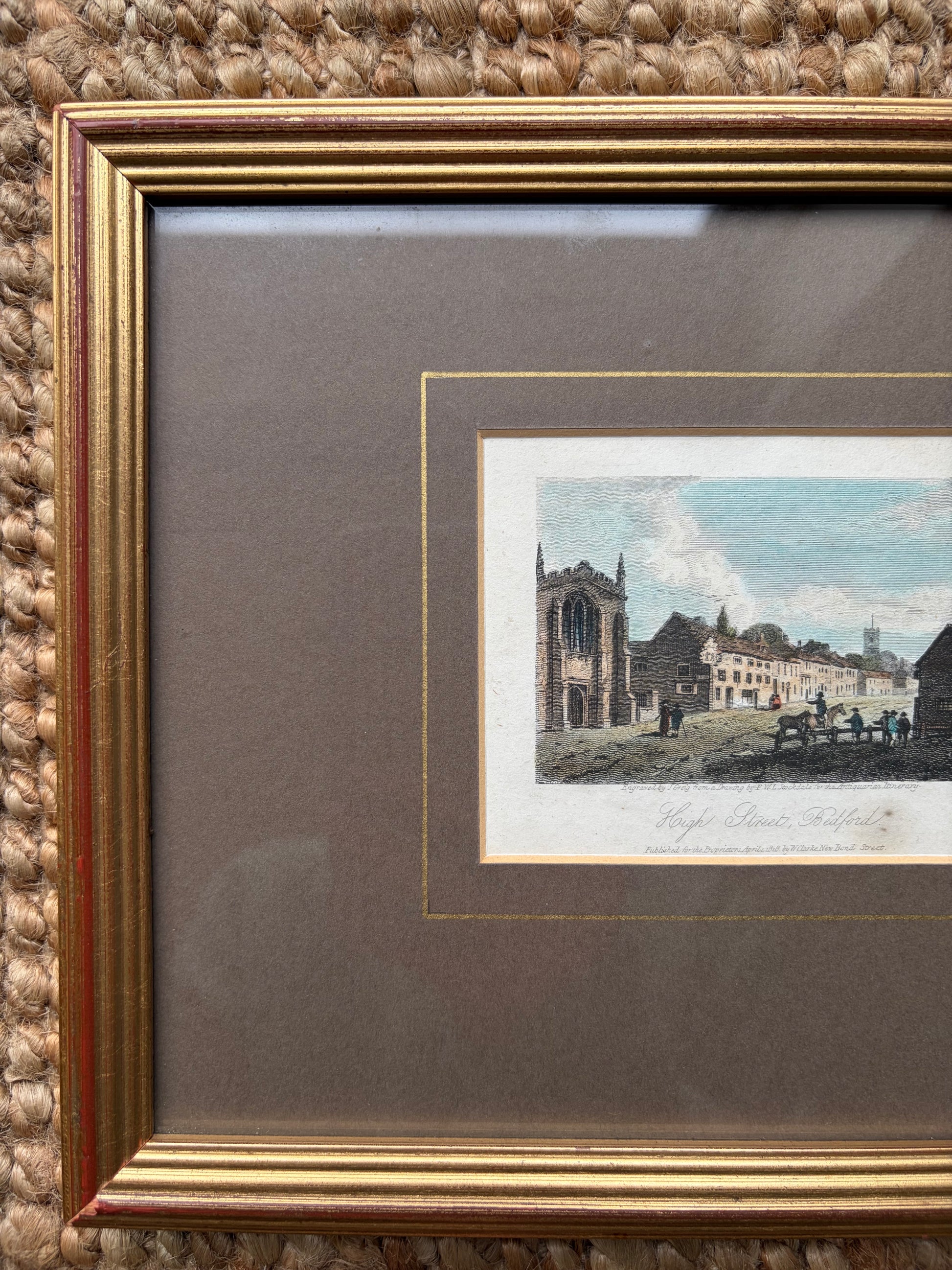 A small antique engraving of a UK high street (Bedford) published in 1818. Framed in a gilt frame with glazing and a brown mount.