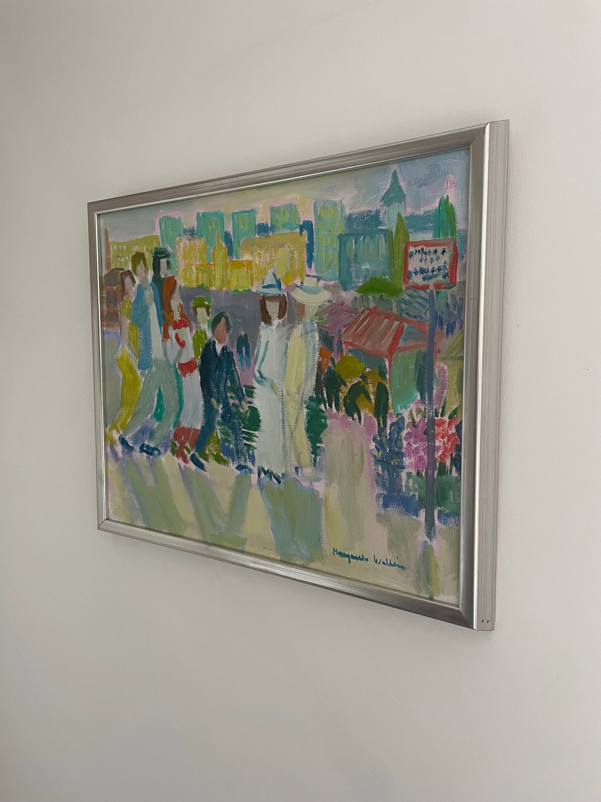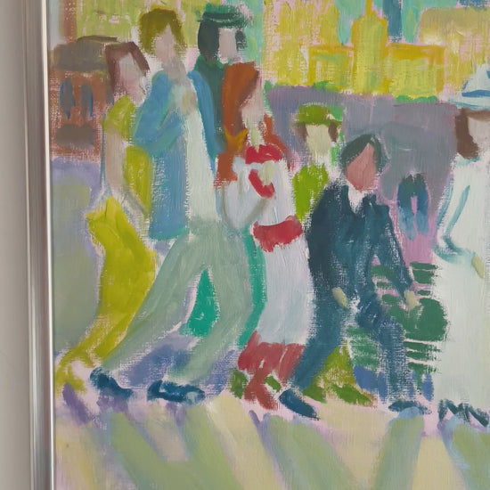 A vibrant and joyful impressionist scene by Margareta Wallin (1912-1992), capturing a group of elegantly dressed figures strolling through a bustling park near the city.