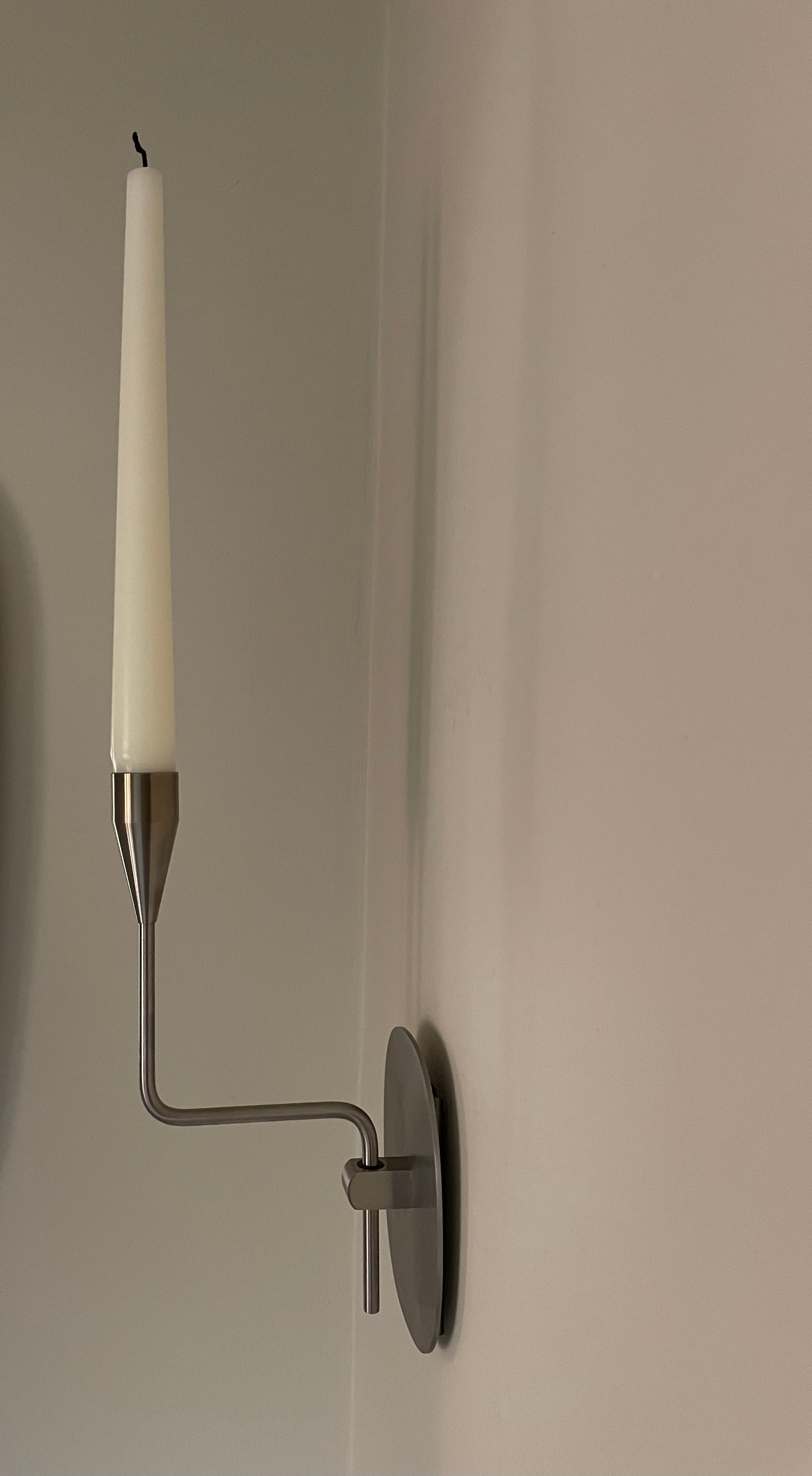 Designed by Piet Hein (1905-1996), a Danish mathematician, architect and poet. It’s no surprise that these sconces are well designed and very sturdy. The bracket slides off for fixing to the wall so that you can easily mark the two holes and fix with screws, after which you can slide the sconces over the bracket.