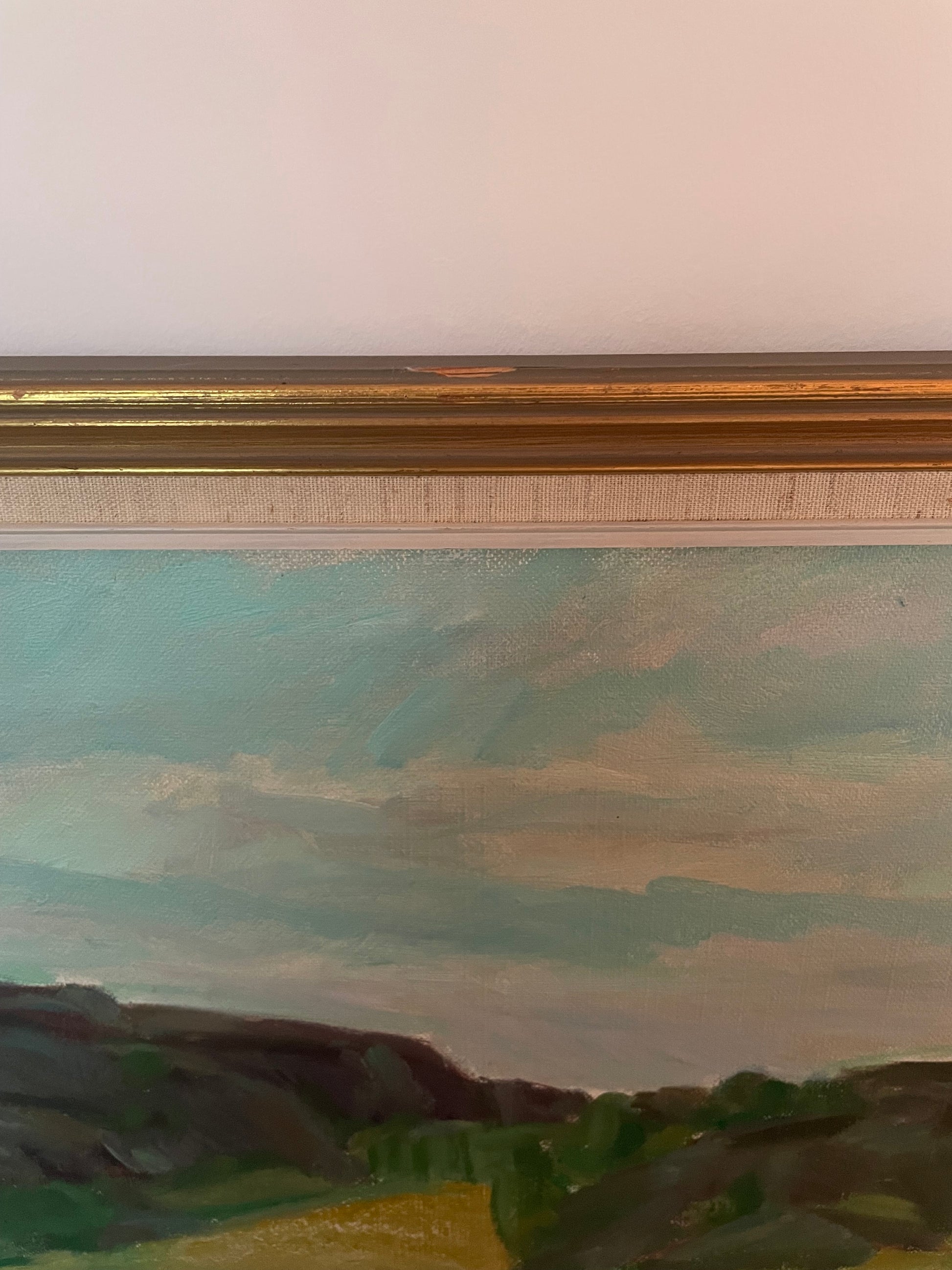 Measures 53 x 68cm including the gold wooden frame. Great size for above a bed, sofa, mantle etc.