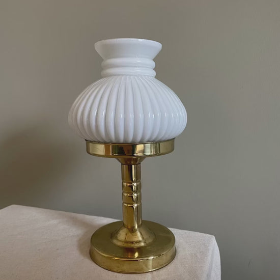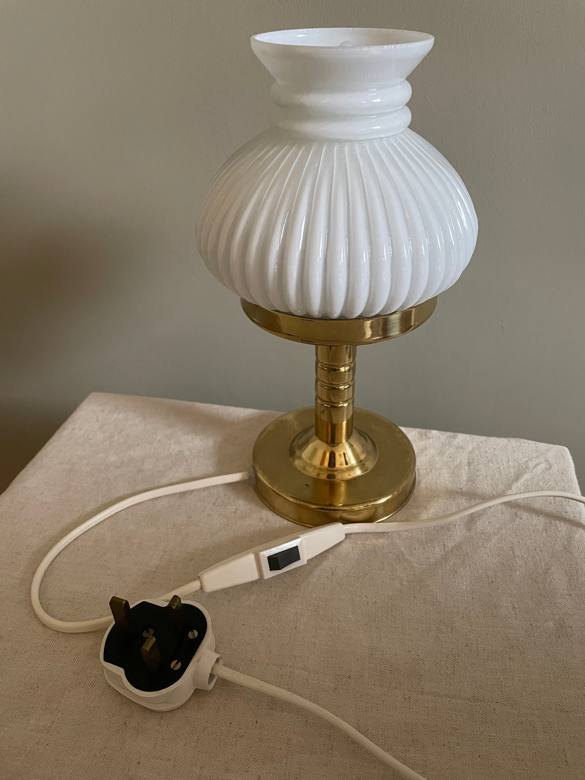 A vintage brass lamp with a white milk glass shade, made in Denmark.
