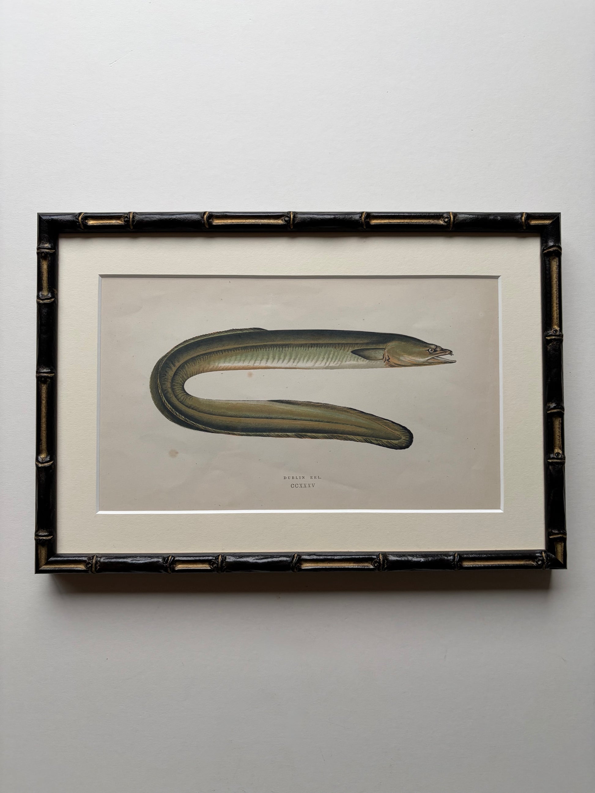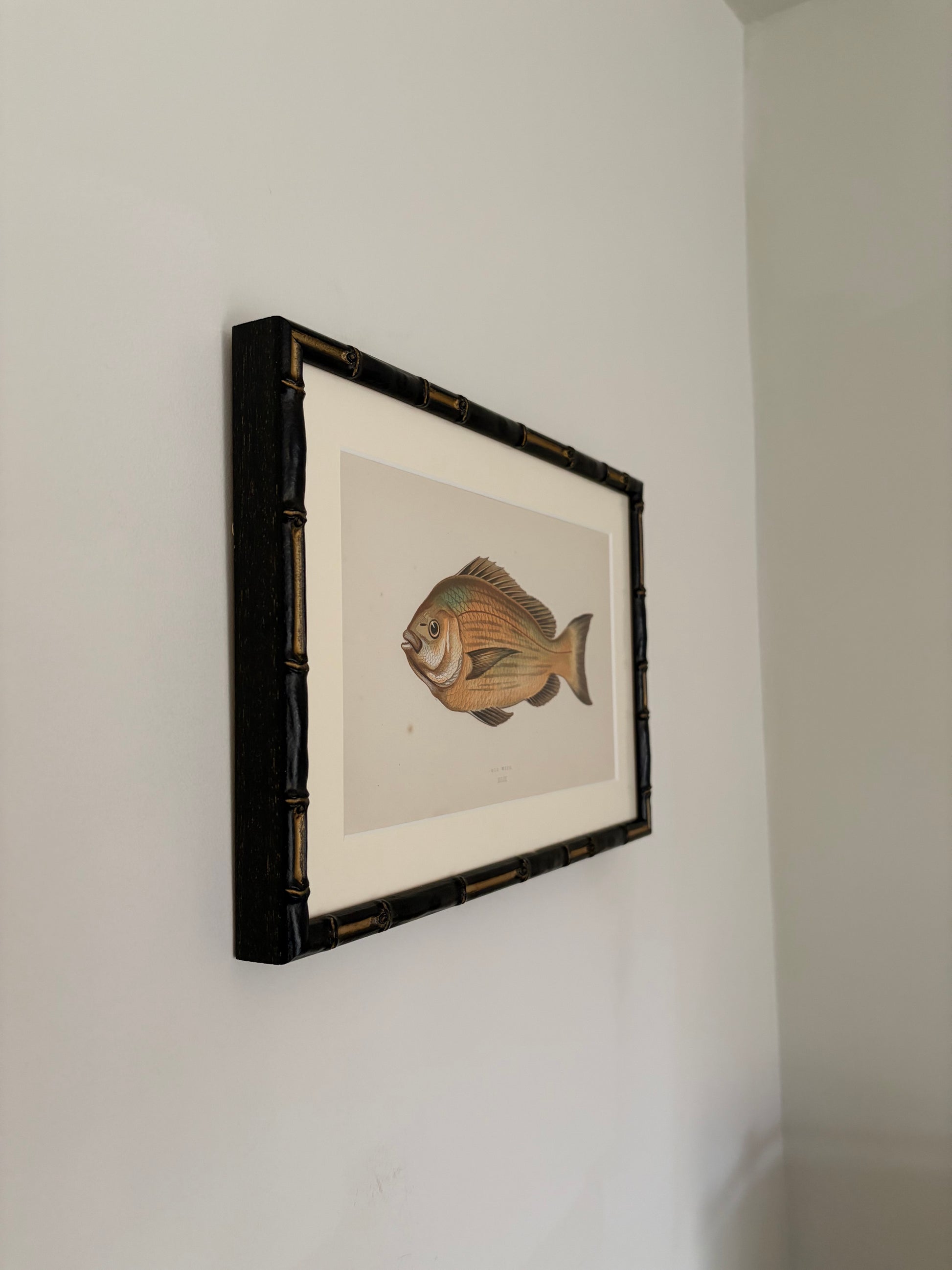 A set of three fish antique plate engravings by Jonathan Couch and published by Groombridge and Sons, circa 1865. This wonderful set of antique prints has been professionally framed in black wooden bamboo style frames with a cream mount and acrylic glazing.